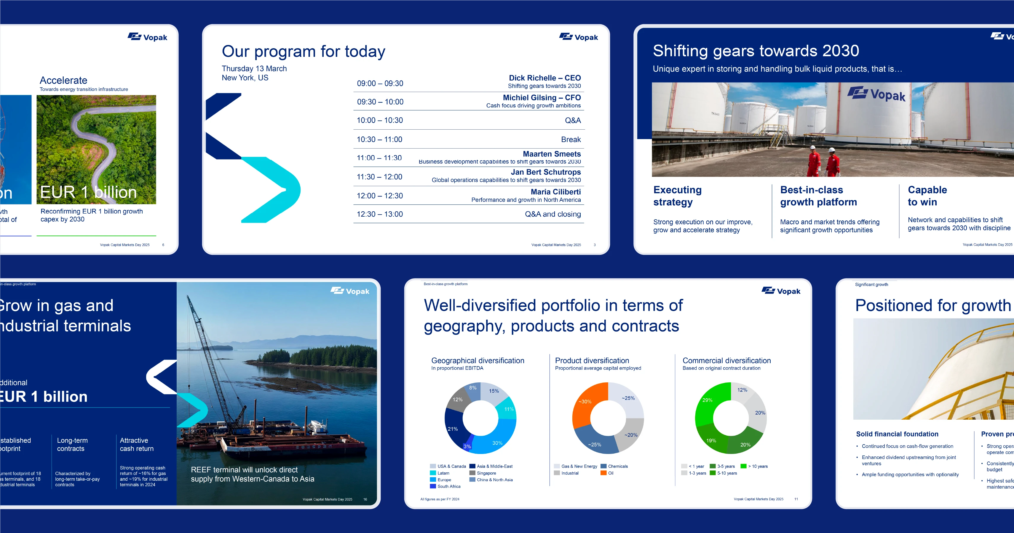 To support this transformation, DartDesign developed a renewed corporate and investor narrative, crafted to reinforce trust in Vopak’s long-term value creation. The new brand identity communicates both resilience and ambition: celebrating the strength of the business today, while making clear its pioneering role in distributing the fuels of tomorrow. This narrative was introduced at the Analyst & Investor Day as a foundation for strategic dialogue with stakeholders worldwide.